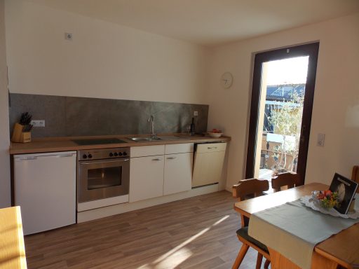 Vollausgestattete Küche mit Spülmaschine, Backofen, Cerankochfeld, Kaffeemaschine, Wasserkocher und Toaster.